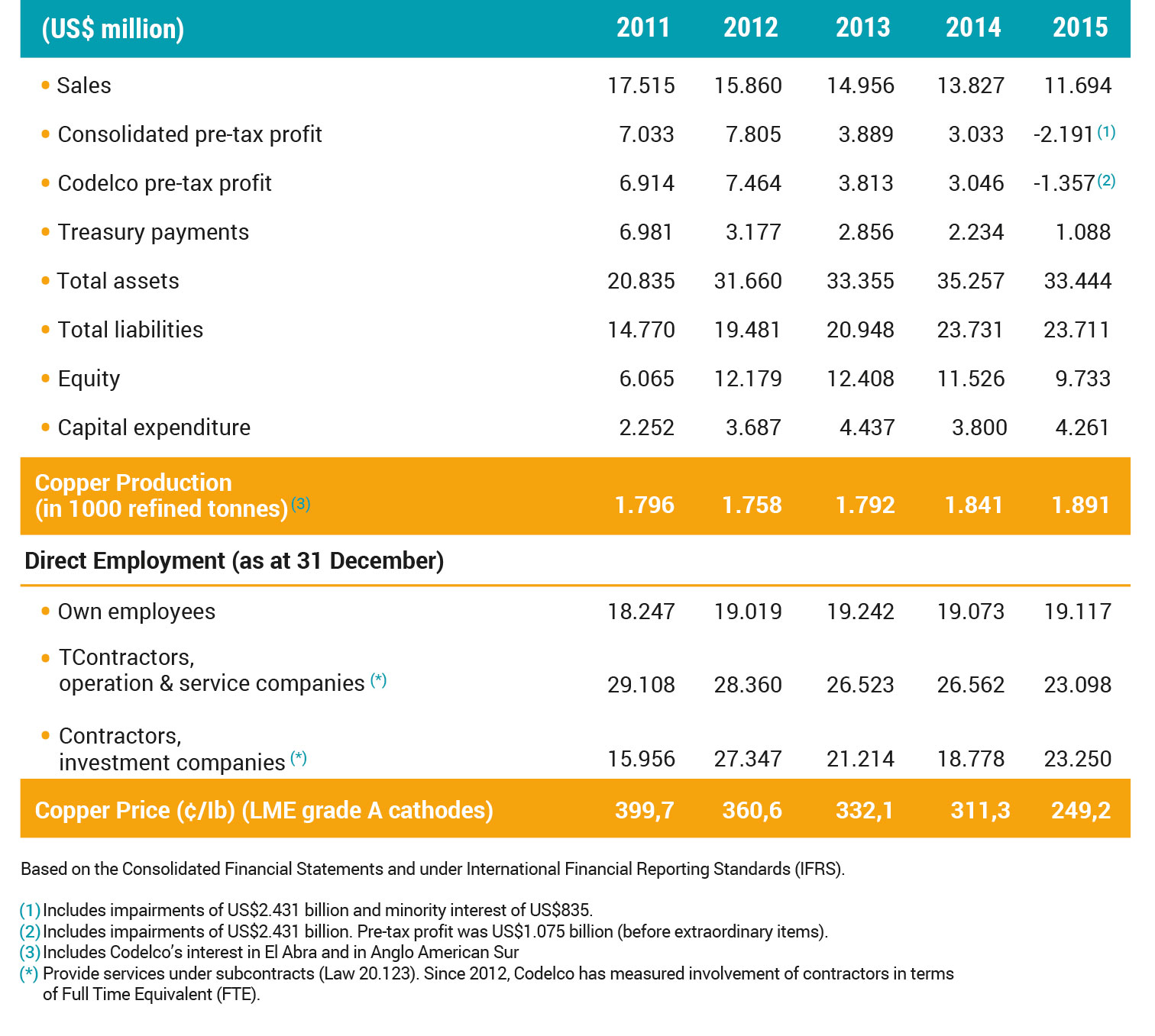 In 2015, pre-tax profits were primarily affected by falling copper and by-products prices; but this was partially offset by the Company’s continuity plan, reducing costs and increasing productivity. Pre-tax profit refers to earnings before tax and Law 13,196 that levies a 10% tax on return on foreign sales of own-sourced copper and by-products.